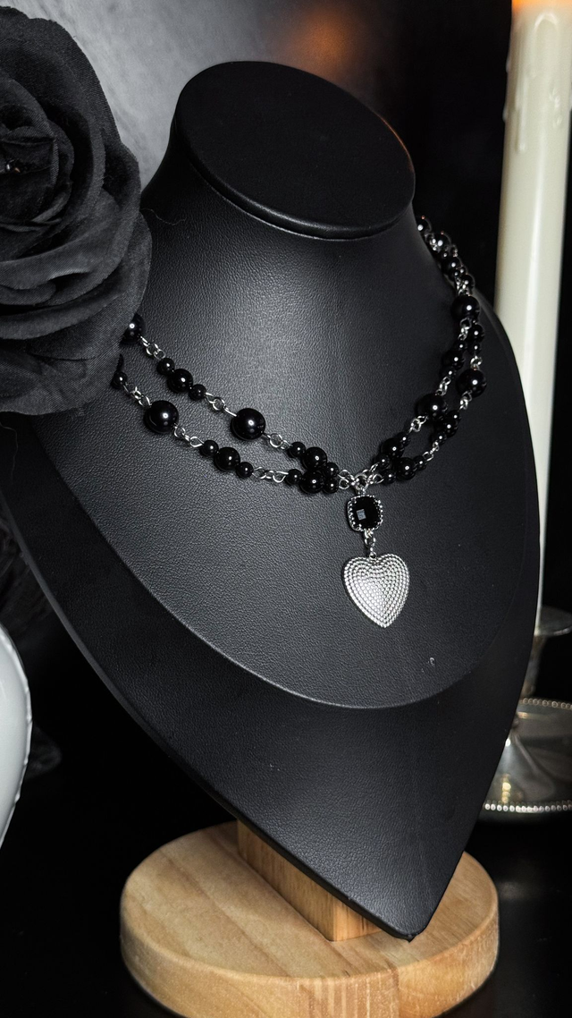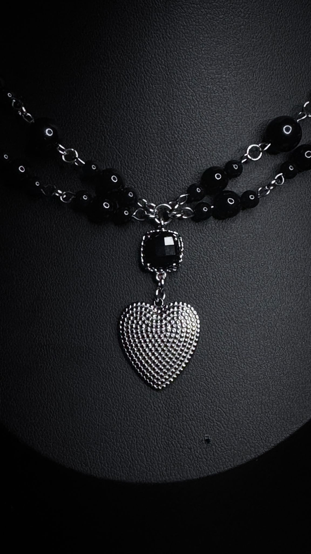 Ce collier argenté est composé de perles noires apportant profondeur et caractère, et sublimé par un pendentif coeur argenté, symbole intemporel de dévotion et d'attachement.