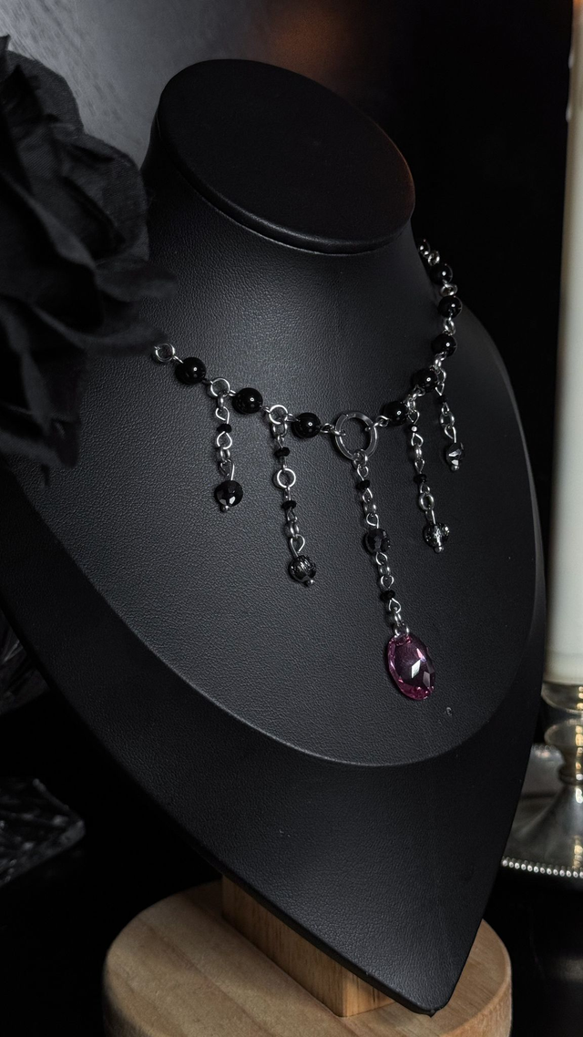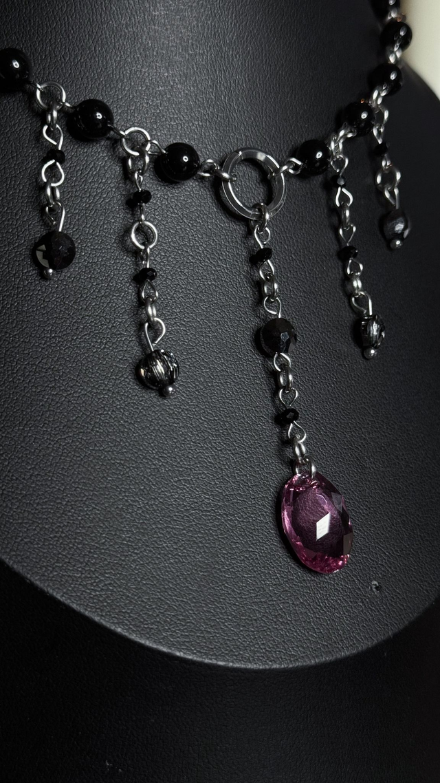 Composé de perles noires, ce collier délicat est ponctué de chaînes fines de perles facettées et de perles Pure Crystal, qui suivent le mouvement avec subtilité.