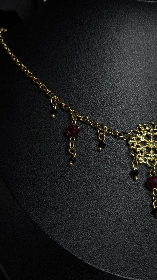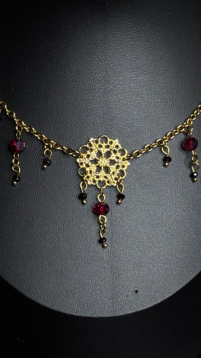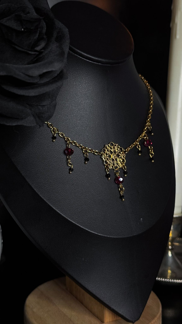 Ce collier doré minimaliste se compose d'une chaine fine, de petites perles facettées rouges et noires et d'un intercalaire rond filigrané placé au centre.