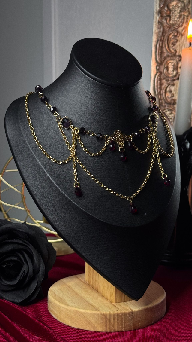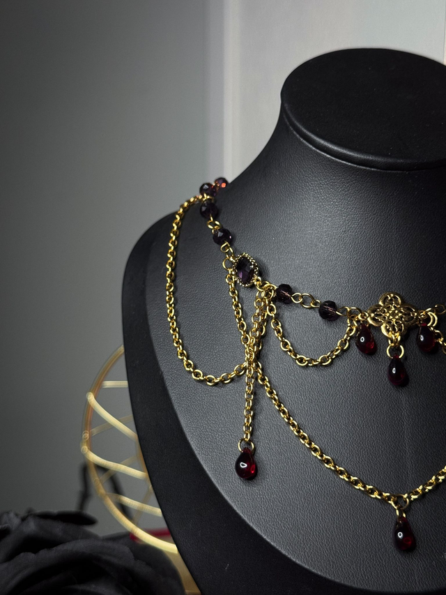 Collier doré composé de perles en verre violettes, de gouttes rouges en verre, d'apprêts Crystal Glass violets et d'un ornement doré.